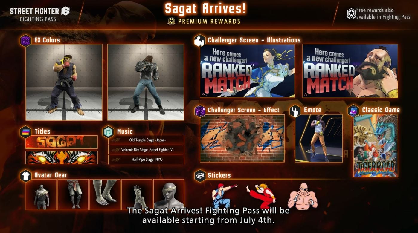 This concept isn’t just Bandai Namco’s Tekken team either, Street Fighter and Guilty Gear both love to force you to bring your quarters with you every time you boot up the game, too. Every season pass, at least 75% of the characters they add are from previous titles. Hell, Sagat was just announced for Street Fighter 6’s newest season, and he has been a playable character since Street Fighter II in 1992! Go rob the f*cking swear jar(there, have a quarter), it’s time to play a character that debuted 33 years ago. Asking you to pay for fighters you have a deep love for is bad enough, but there is another piece of this capitalistic puzzle I have to touch on as well. Battle Passes.